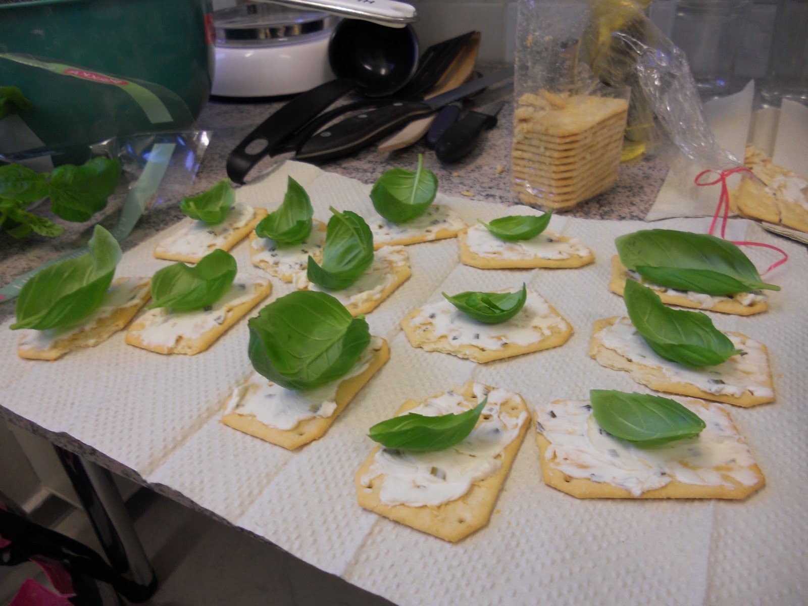| Tuc-leipäset -tuc-keksejä tai muita suolakeksejä -tuorejuustoa -tuoretta basilikaa Voitele suolakeksit tuorejuustolla ja koristele basilikan lehdillä! |